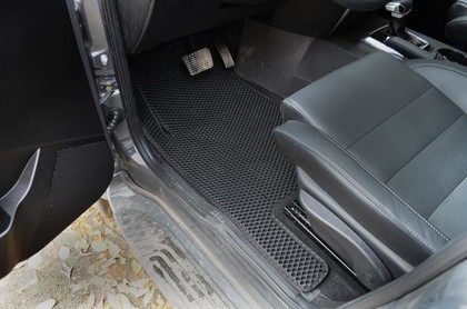Автоковрики ЕВА не впитывают, а удерживают грязь в ячейках. Вода не катается по полу, как в резиновых половичках, однако, её все равно видно. ЕВА удобны тем, что их легко достать не пролив и вытряхнуть. Они дешевле.
